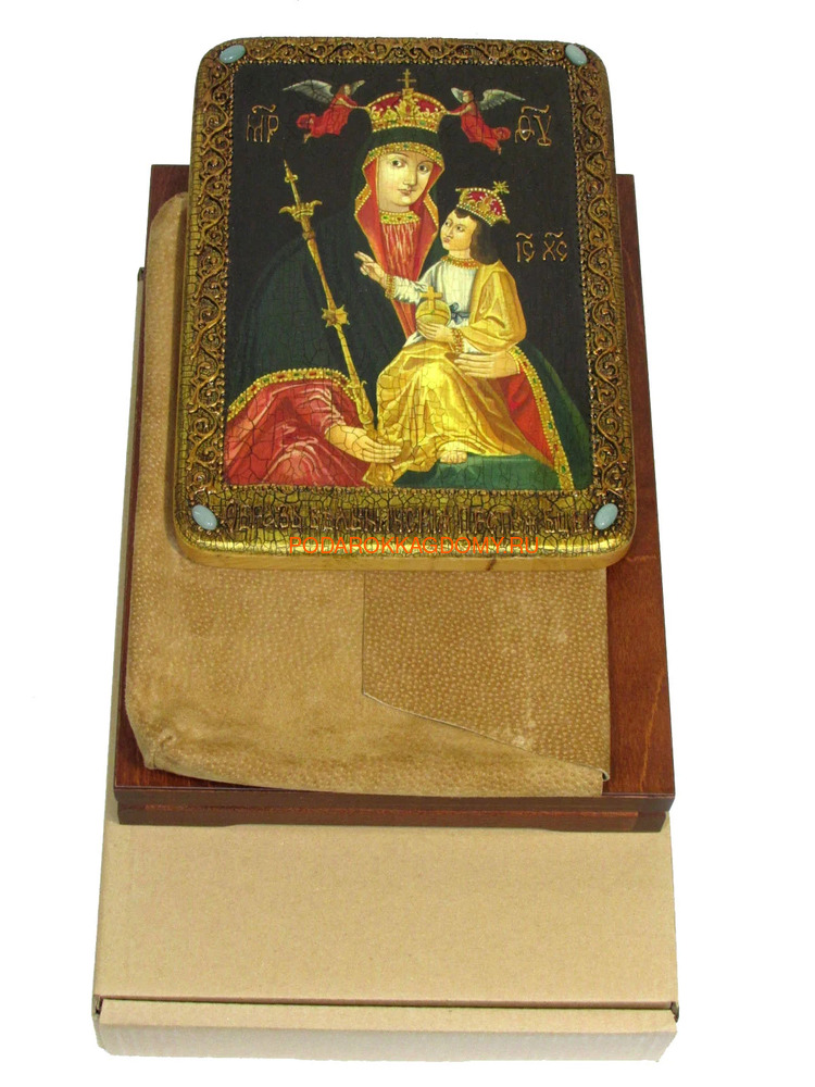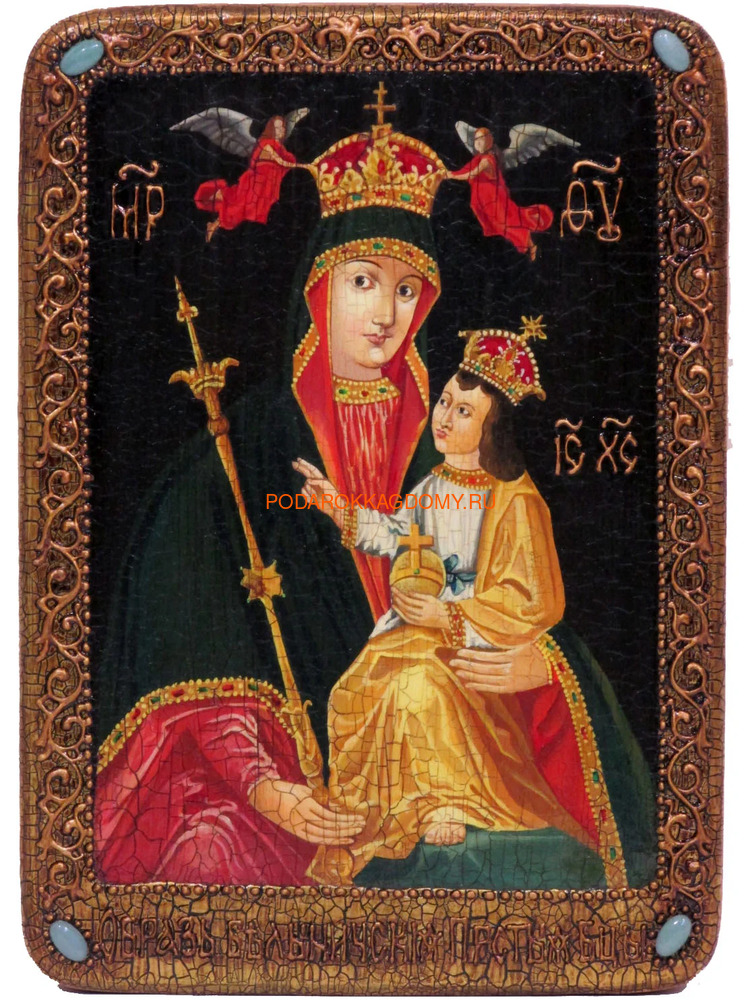 Рукописная Белыничская икона Божьей Матери в живописном стиле (07349) с венцом и полями вручную украшенными рельефным орнаментом и натуральным жемчугом. Упакована в шкатулку.