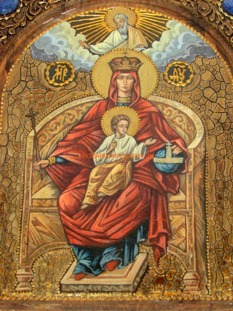 Рукописная Державная икона Божьей Матери в живописном стиле (07519) с венцами и полями вручную украшенными рельефным орнаментом и натуральным жемчугом. Упакована в шкатулку.