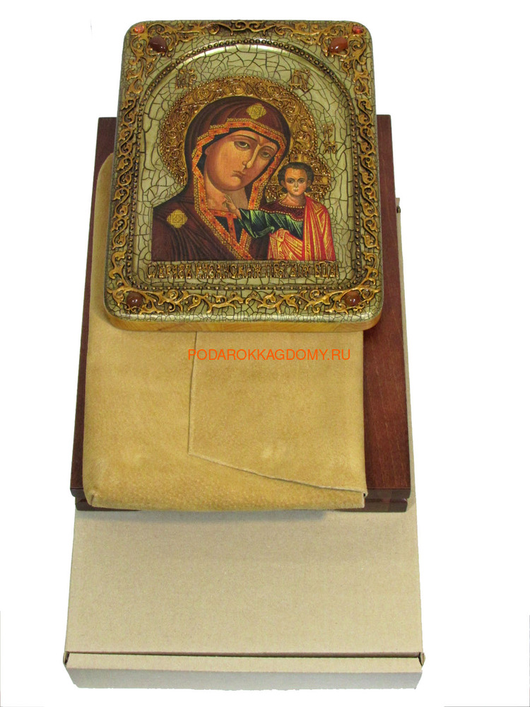Рукописная Казанская икона Божьей Матери в живописном стиле (0767) с венцами и полями вручную украшенными рельефным орнаментом и натуральным жемчугом. Упакована в шкатулку.