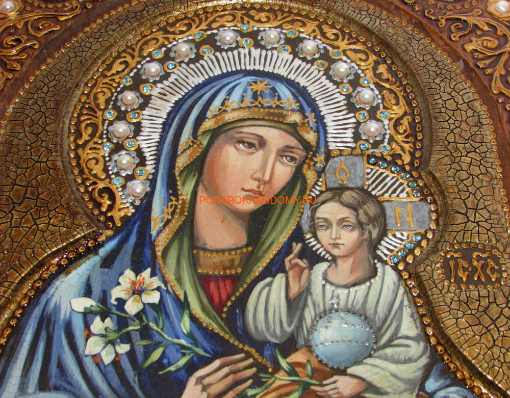 Рукописная икона Божьей Матери Неувядаемый Цвет в живописном стиле (07545) с венцами и полями вручную украшенными рельефным орнаментом и натуральным жемчугом. Упакована в шкатулку.
