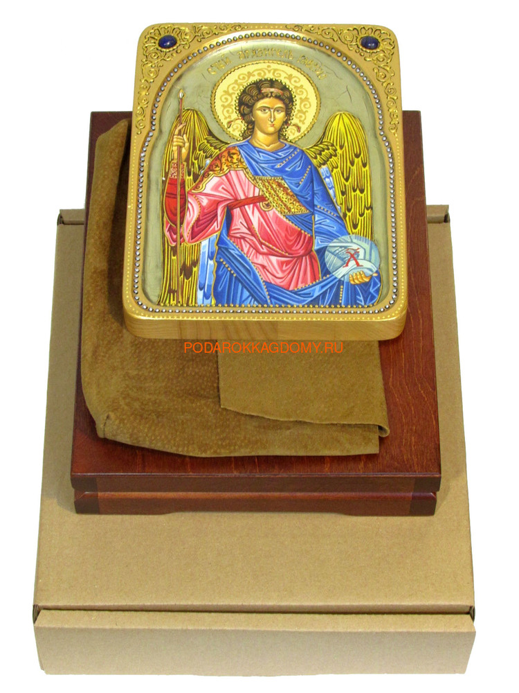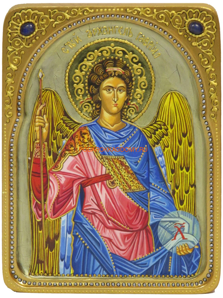 Рукописная икона Архангел Гавриил в живописном стиле (071609) с венцами и полями выполненными вручную в стилистике русского орнамента. Украшена натуральным жемчугом и рельефным орнаментом. Упакована в шкатулку.