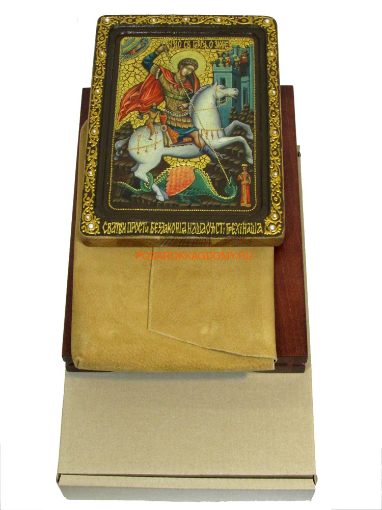 Рукописная икона Чудо святого Георгия о змие в живописном стиле (07543) с венцами и полями вручную украшенными рельефным орнаментом и натуральным жемчугом. Упакована в шкатулку.