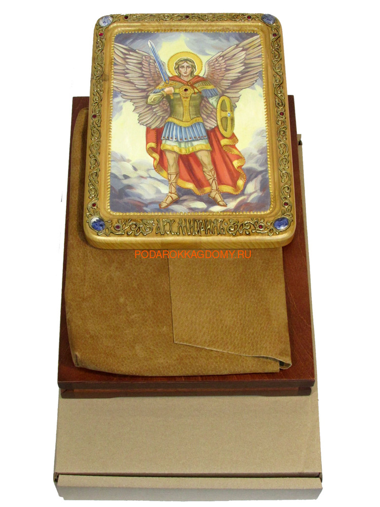 Рукописная икона Архангел Михаил в живописном стиле (07402) написанная на натуральной деревянной доске, изготовленной из массива сакрального кипариса с выборкой двойного ковчега. Для оформления образа использованы специальные грунты и выравнивающие лаки. Венец и поля украшены вручную в стилистике русского орнамента, с дополнением натурального содолита и фианитов.
