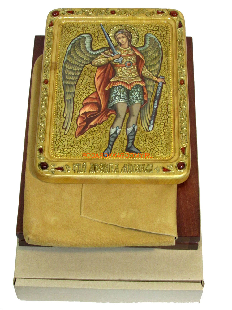 Рукописная икона Архангел Михаил в живописном стиле (07483) с венцами и полями украшенными вручную в стилистике русского орнамента. Упакована в шкатулку.
