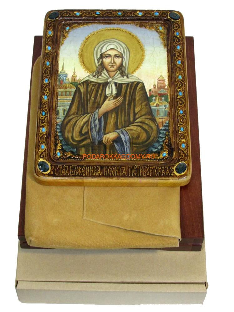 Рукописная икона Святая Блаженная Ксения Петербургская в живописном стиле (07529) для написания которой использованы специальные фронтажные грунты, выравнивающие лаки и темперные краски. Украшена рельефным орнаментом. Упакована в шкатулку.
