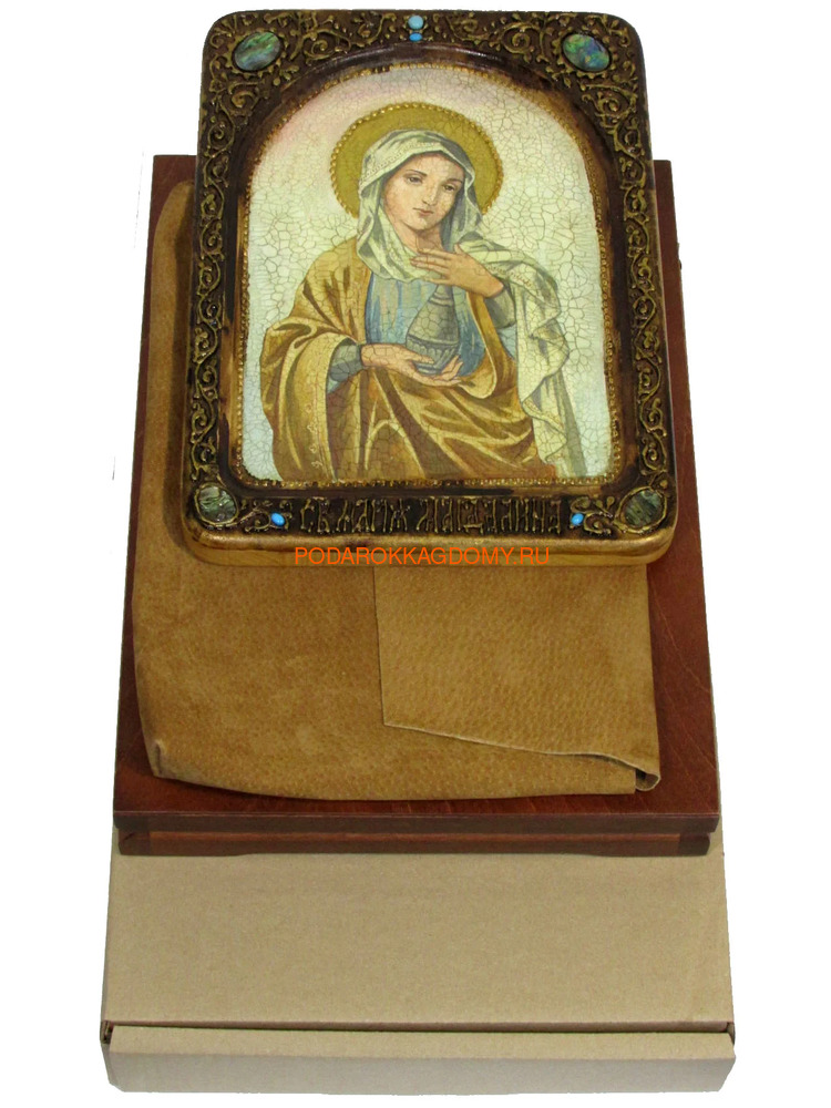 Рукописная икона Мария Магдалин в живописном стиле (07721) с венцами и полями вручную украшенными рельефным орнаментом и натуральным жемчугом. Упакована в шкатулку.