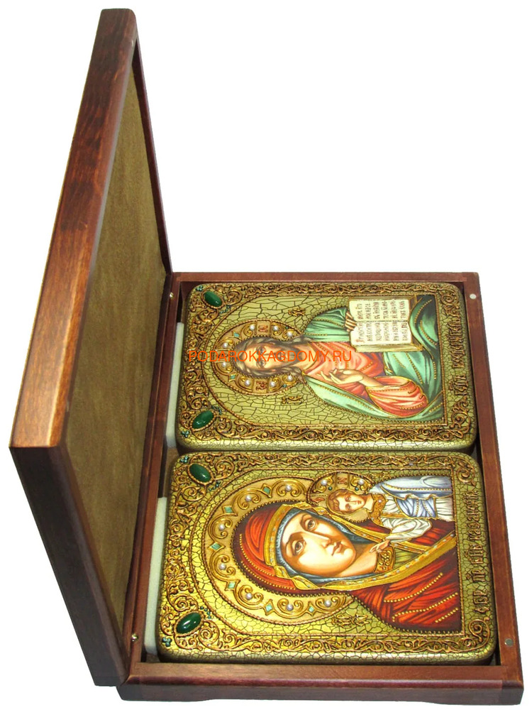 Рукописная венчальная пара икон Казанская Божья Матерь и Господь Вседержитель (07780) с венцами и полями вручную украшенными рельефным орнаментом и натуральным жемчугом. Упакована в шкатулку.