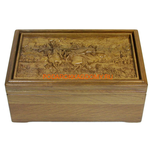 Это классический комплект для игры в русское лото. Помимо обязательных для подобных наборов бочонков в мешочке и карточек в его состав входит маленькая шкатулочка с деревянными закрывашками выпавших чисел. Лицевую панель украшает трехмерная репродукция прекрасной картины русского живописца "Битва Пересвета с Челубеем на Куликовом поле".