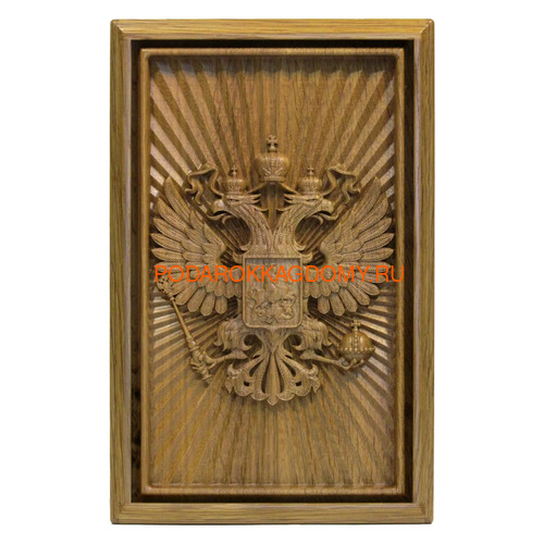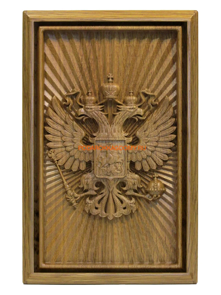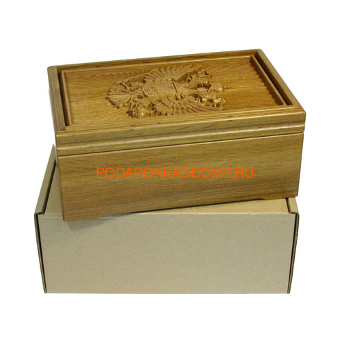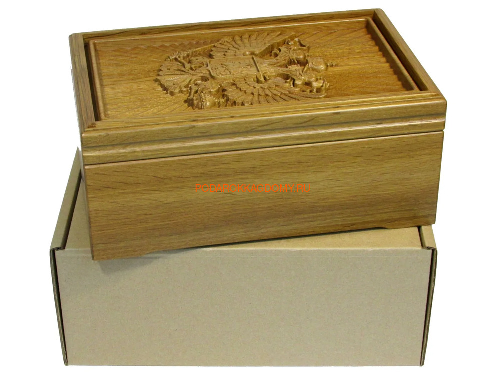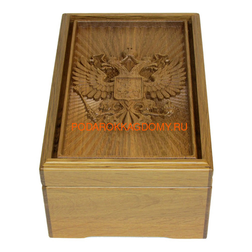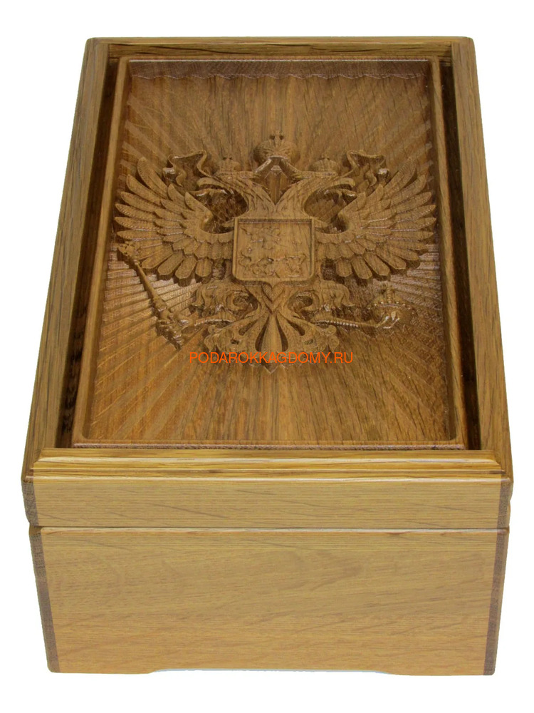 Лицевую панель шкатулки украшает стилизованная трехмерная репродукция герба Российской Федерации.