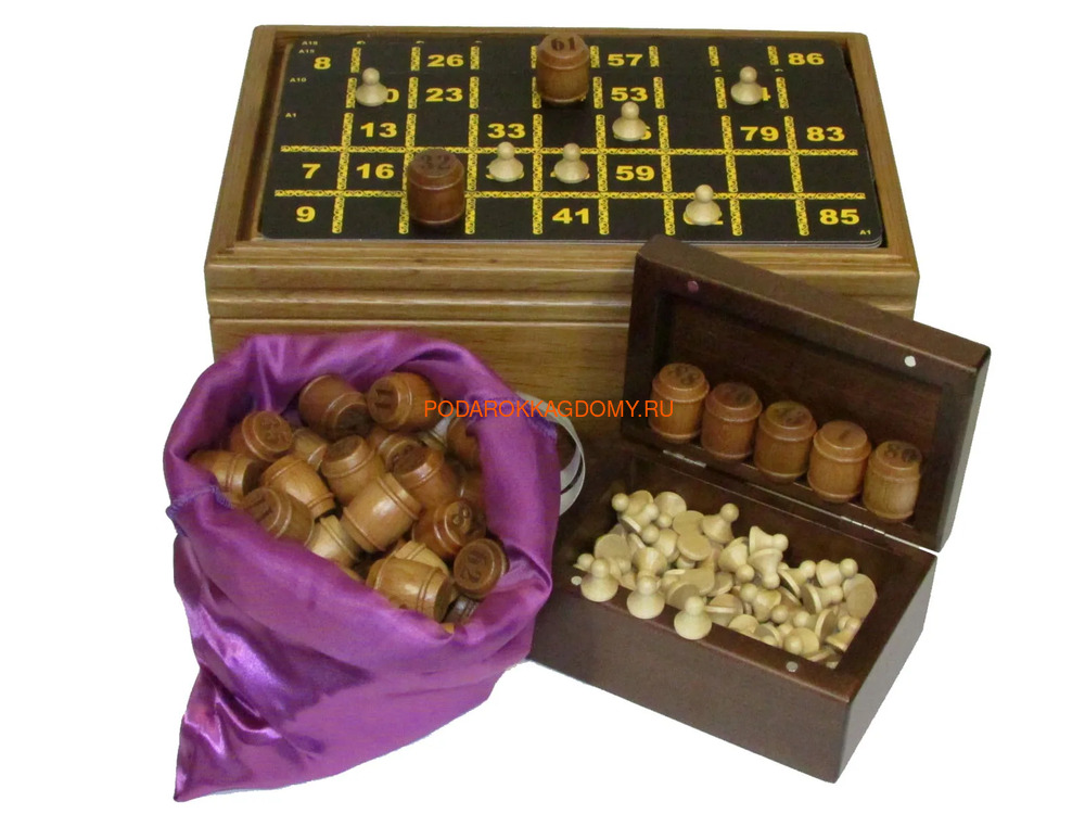 Это классический комплект для игры в русское лото. Помимо обязательных для подобных наборов бочонков в мешочке и карточек в его состав входит маленькая шкатулочка с деревянными закрывашками выпавших чисел.