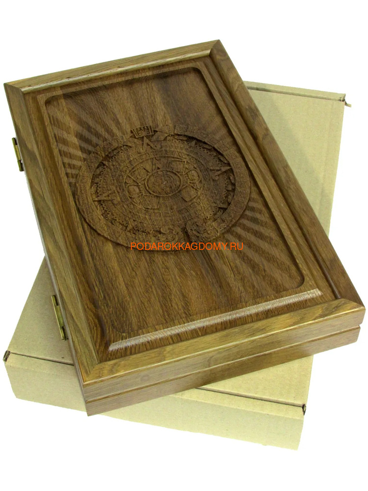 Нарды резные "Календарь Майя" (071190) посвящённые системе летоисчисления созданной в доколумбовой Америке и предсказывающей будущие события, а также символизирующей циклическую природу времени. Доска с возможностью как выставить, так и хранить все фишки и кости вдоль края. На оборотной филёнке поле для игры в шашки.