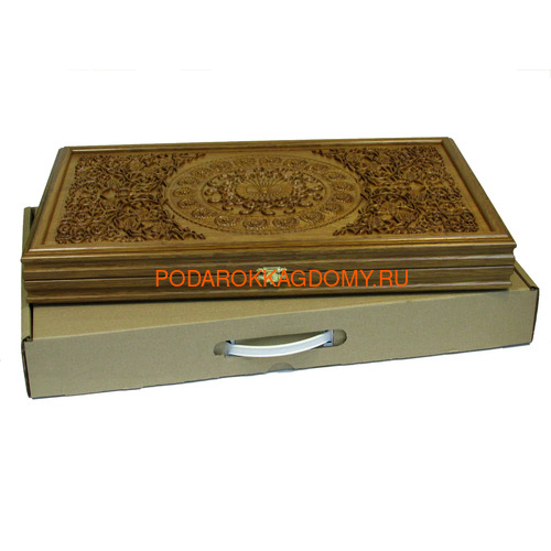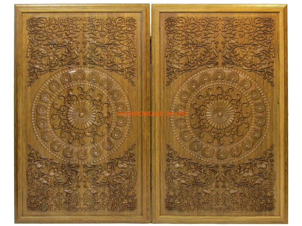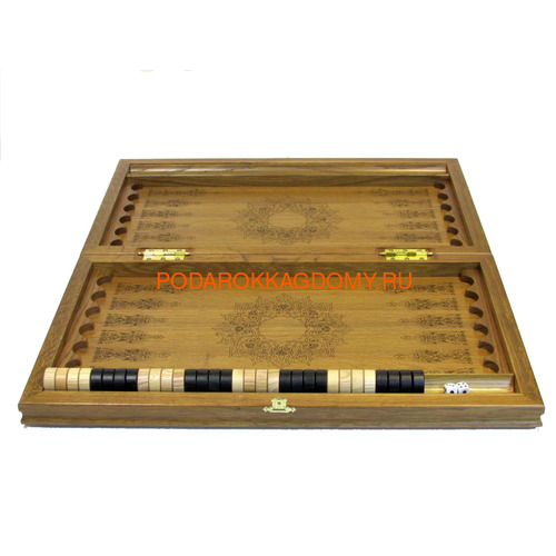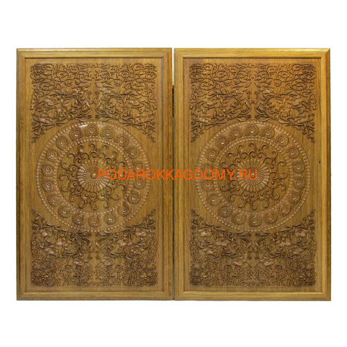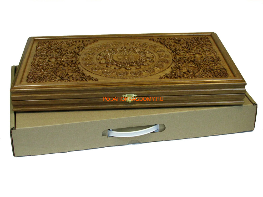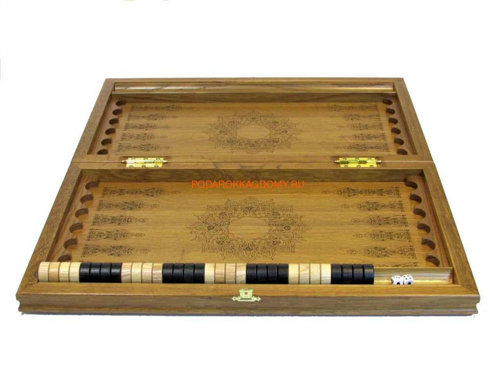 На обеих сторонах вырезан стилизованный орнамент. Доска соответствует всем основным запросам любителей игры в нарды:- - Деревянные фишки из массива бука или ясеня с углублением по центру.