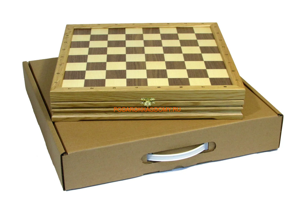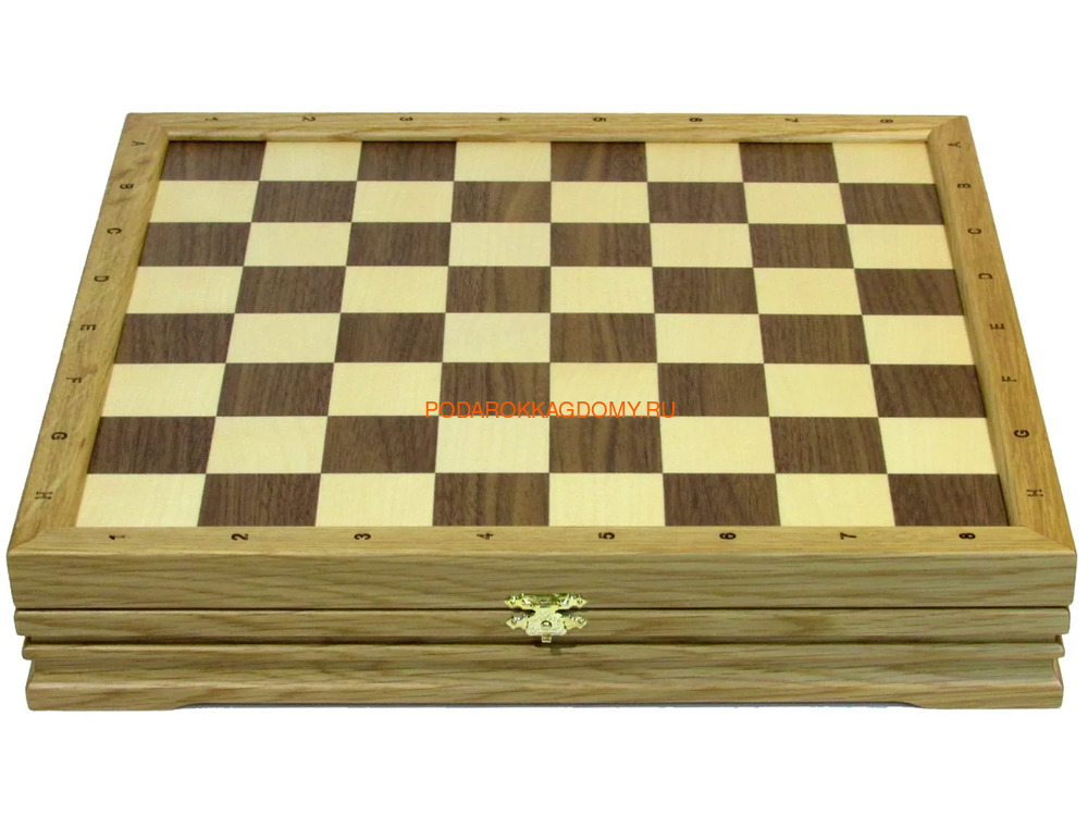 - Размер клетки поля 37х37 мм. Соответственно, максимально удобный диаметр основания фигур для этой доски - 31 мм. Внутренняя сторона игрового поля и дно доски шпонированы белым дубом.
