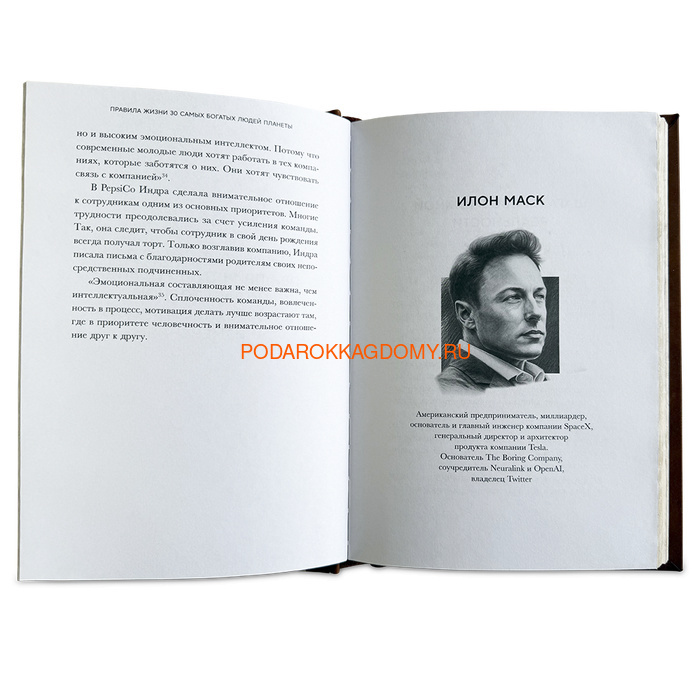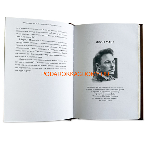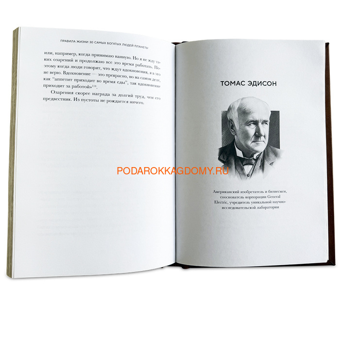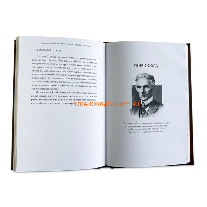 Подарочная книга в кожаном переплёте "Правила жизни 30 самых богатых людей планеты" (06214) это издание в котором собран опыт людей вошедших в историю благодаря своим достижениям в бизнесе, науке, искусстве, технологиях, без которых невозможно представить привычный мир. Это и Уоррен Баффет, Илон Маск, Уолт Дисней, Павел Дуров, Билл Гейтс, Генри Форд и многие другие, истории жизни которых на своем примере учат финансовой независимости, дисциплине, принятию решений, вдохновляют к достижению целей, формированию списка принципов, не отступать перед поражениями, сосредотачиваться на целях и налаживать нужные контакты.